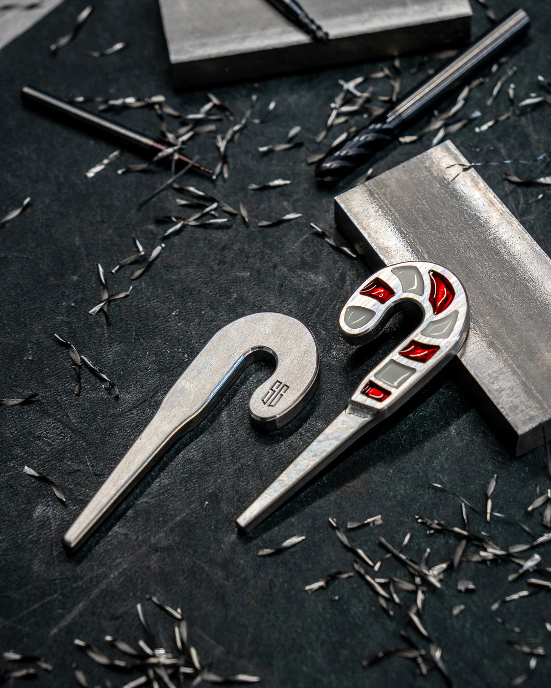 Raw finish showing all the milling affects. White and Red paintfill.